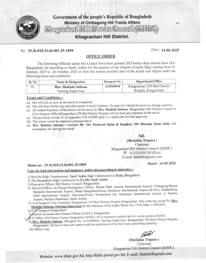 | জনাব শাহীদা সুলতানা | নার্সিং সুপারভাইজর | ২৫০ বেড হাসপাতাল, খাগড়াছড়ি | ডাউনলোড | ১৪/০৮/২০২৫ |