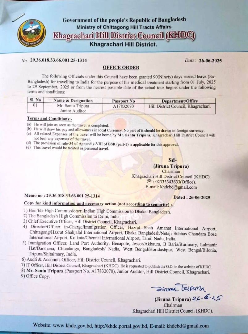 | জনাব সান্তু ত্রিপুরা | জুনিয়র অডিটর | খাগড়াছড়ি পার্বত্য জেলা পরিষদ। খাগড়াছড়ি সদর । | ডাউনলোড | ২৬-০৬-২০২৫ |